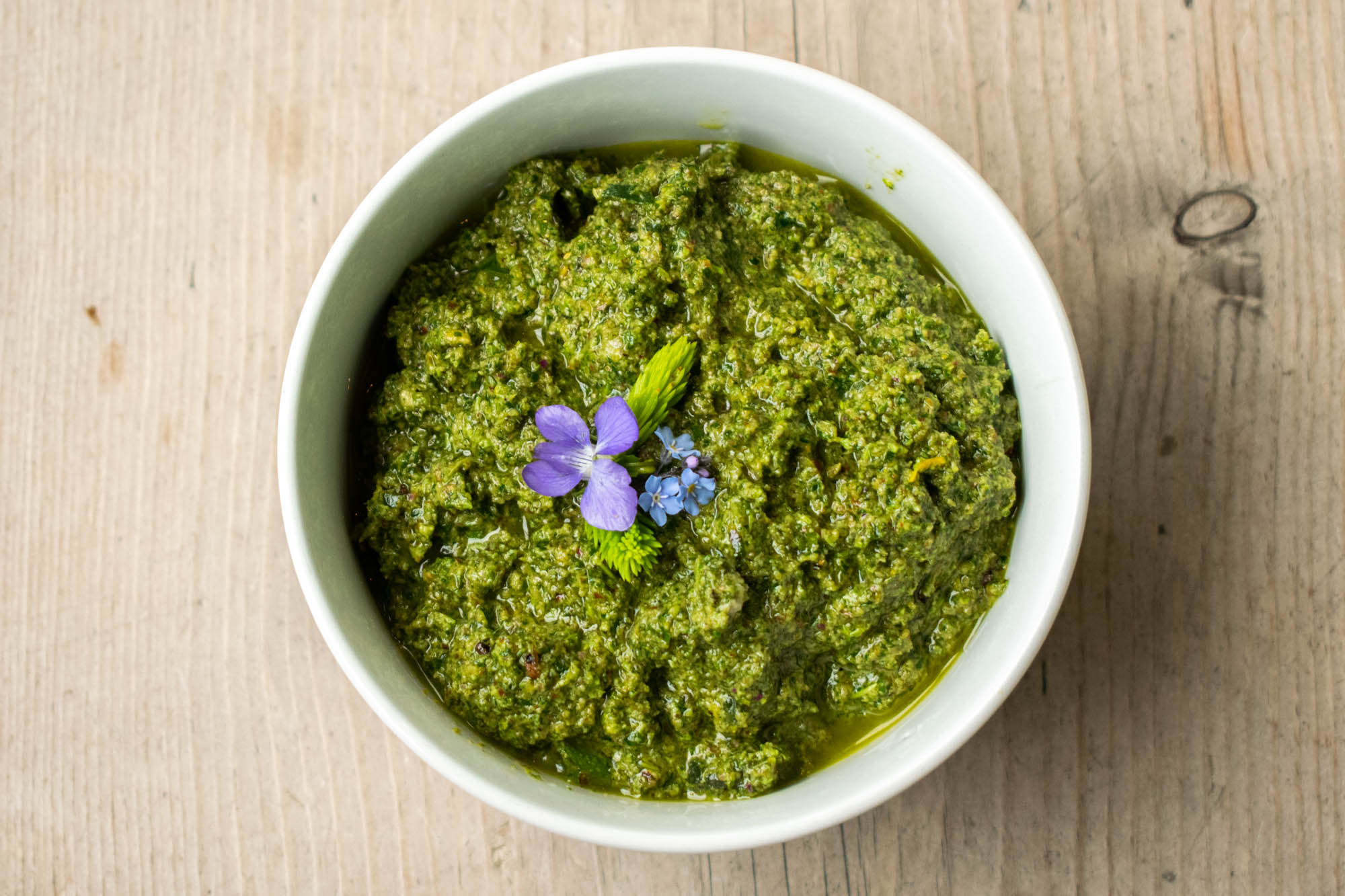Etter sanketuren returnerte vi til kjøkkenet, og alle bladene og blomstene ble skylt grundig i rennende vann og så kjørt i en blender til en nydelig ugresspesto sammen med litt olje og salt. Resultatet ble en velsmakende ugresspesto som serveres som tilbehør til ulike retter i restauranten. Nydelig for både nese, gane og øyne!