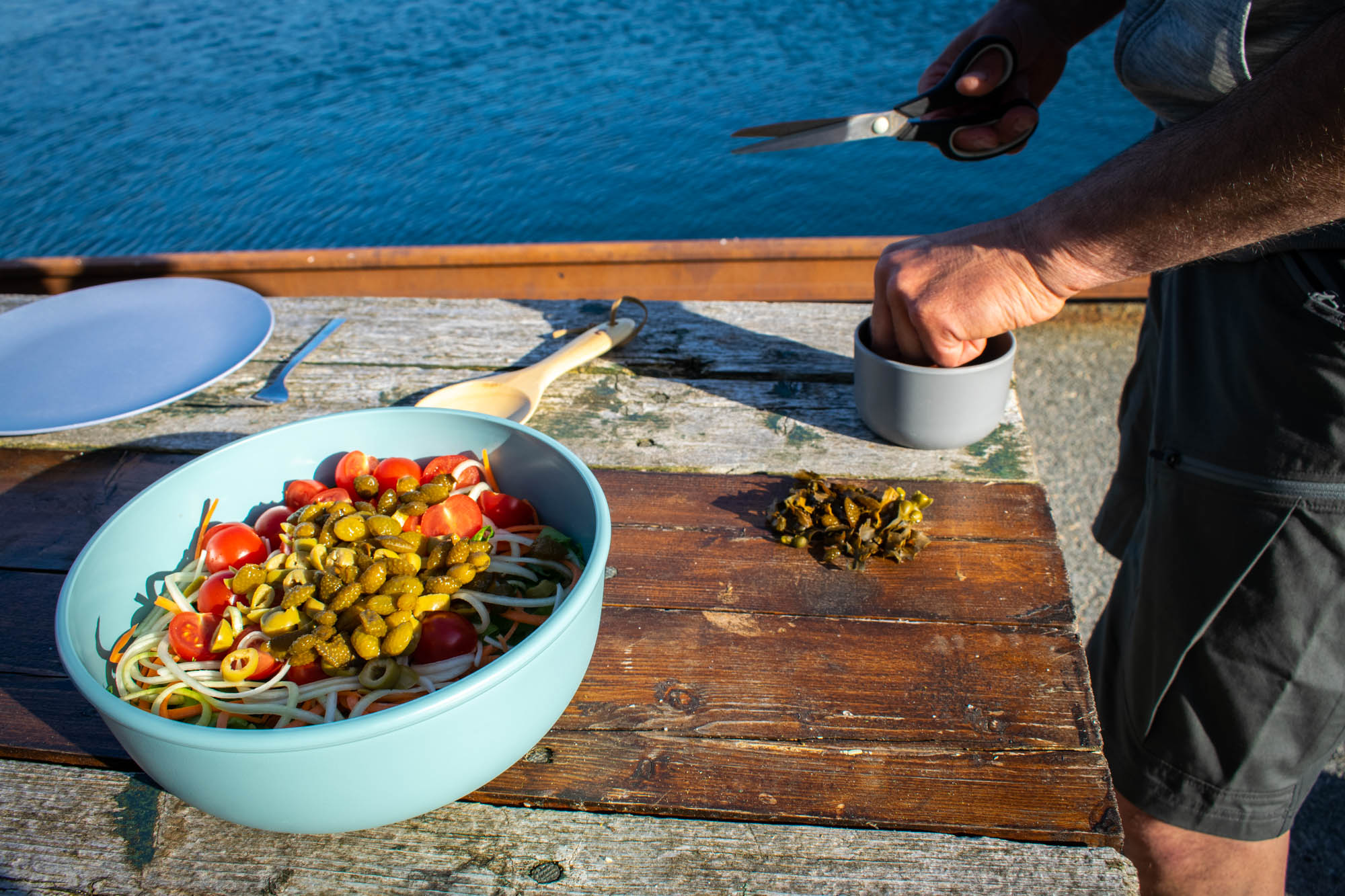 Etter å ha sanket med en del ulike typer tang var det tid for matlaging. Vi returnerte vi til brygga hvor vi hadde startet turen fra, og her skulle vi være med å tilberede middag med fangsten vår. Mens maten ble tilberedt fikk jeg også en liten smaksopplevelse med test av ulike produkter som inneholdt tørkede eller bearbeidede tangprodukter, som syltetøy, smakstilsetning på nøtter og i en frisk drikke iblandet sitron og ingefær. Her var det mange gode smaker og nye nyanser av sjø og salt kom frem.