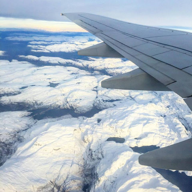 Vinterkledde fjell i Norge under min flytur til Stockholm. Foto fra instagram.com/norskereiseblogger |